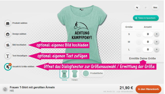 Ein Klick auf das Symbol oben links öffnet das Menü für die Produktauswahl. Sie können entweder in aller Ruhe die gesamte Produktpalette durchstöbern, oder über die Kategorie Auswahl nach den Kategorien Männer, Frauen, Kinder & Babys, Acessoires und Hüllen selektieren. In den Kategorien Männer, Frauen und Kinder werden Ihnen jeweils die verfügbaren Shirts, Pullis, Jacken, Westen und Sweatshirts angezeigt.
